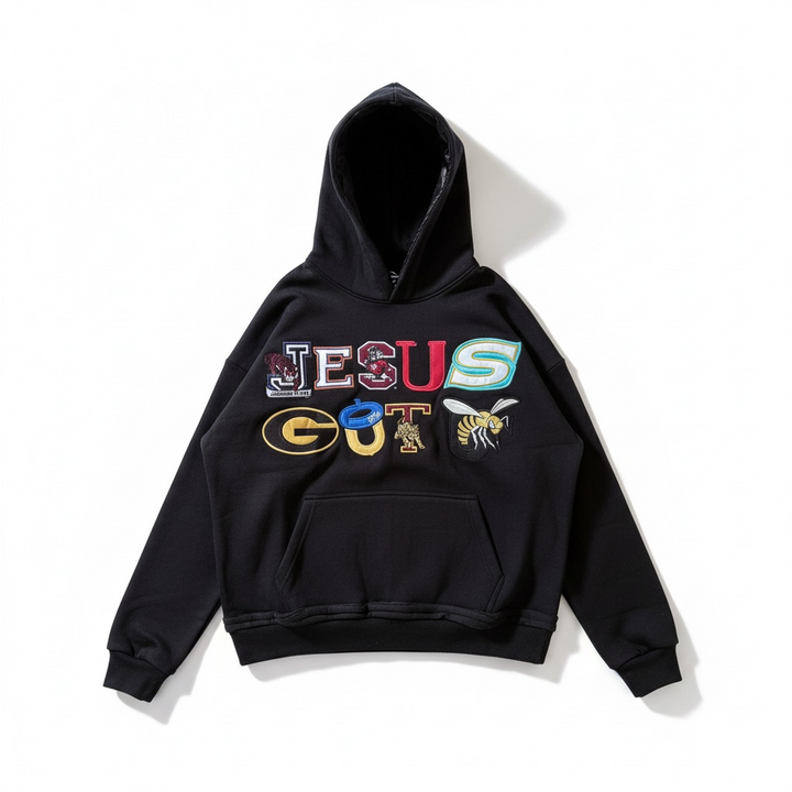The Jesus Got Us Hoodie blends iconic collegiate-inspired lettering with powerful symbolism, creating a statement piece that speaks without saying a word. Designed on a premium heavyweight base, this hoodie features detailed patch-style graphics across the chest, combining vibrant colors with faith-driven energy.