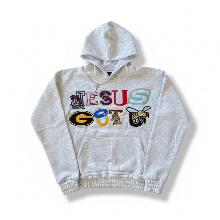 The Jesus Got Us Hoodie blends iconic collegiate-inspired lettering with powerful symbolism, creating a statement piece that speaks without saying a word. Designed on a premium heavyweight base, this hoodie features detailed patch-style graphics across the chest, combining vibrant colors with faith-driven energy.